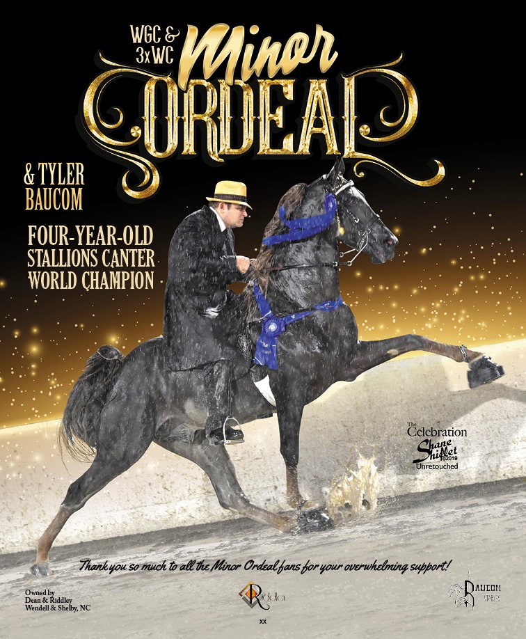 Minor Ordeal was undefeated during his Two-Year-Old year with his maiden win at the 2017 National Trainers Show, that followed with wins at Dallas, North Carolina, The Spring Fun Show and a Two-Year-Old Stallion World Championship and World Grand Championship at the 2017 Celebration.